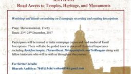 Hands-on training and Workshop on Estampage recording and reading medieval Tamil inscriptions. Participants will be trained to make estampage copies and read medieval Tamil inscriptions. There will also be guided tours to places of Historical Importance including Rockfort temple, Thiruvellarai & Srirangam along with fellow historians.